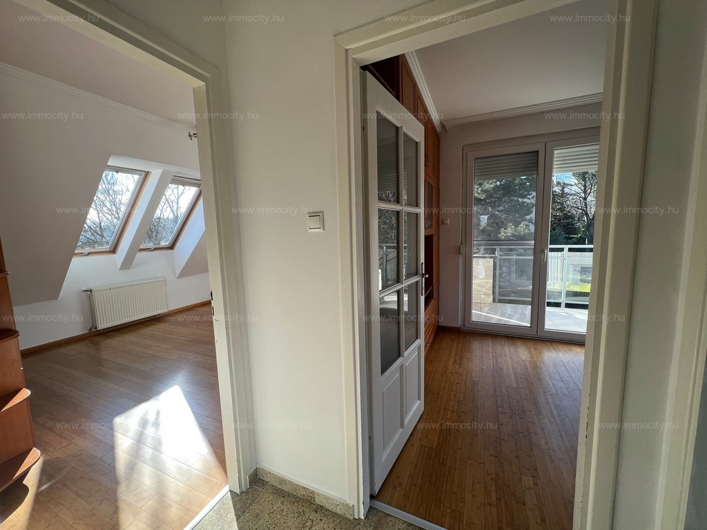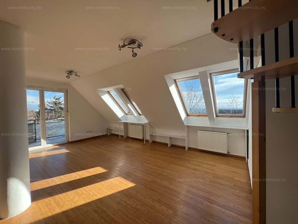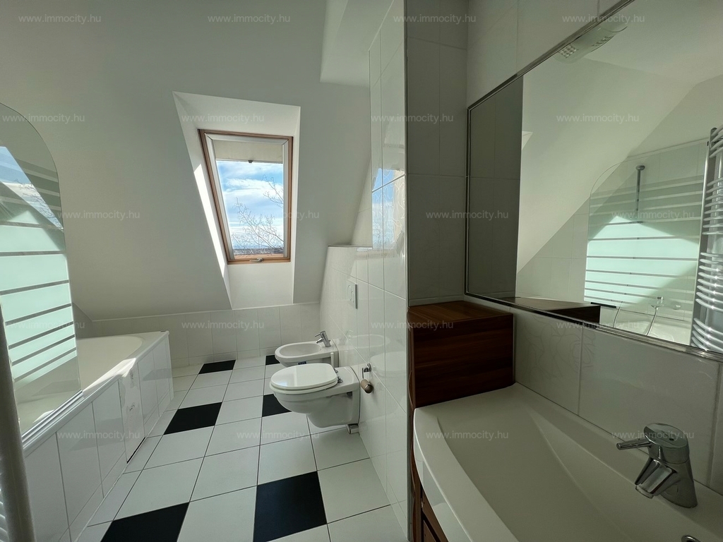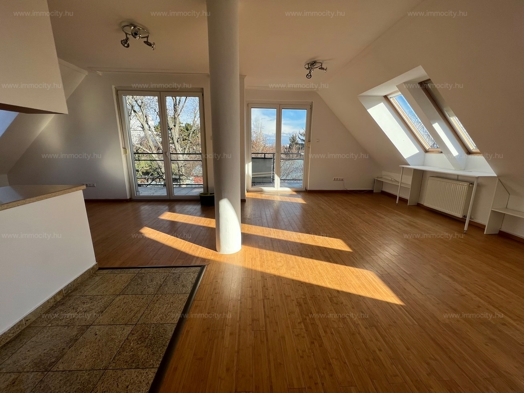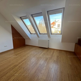 2012-ben épült modern, 7 lakásos, liftes társasház teljes legfelső emeletét elfoglaló lakás 2 terasszal bérelhető. Az eredetileg is szép, tágas lakást a tetőtérben 2 szobával és egy harmadik kis fürdőszobával bővítették ki. (Ez vendégszobának, irodának, gyermek birodalomnak egyaránt ideális). Az egész lakásban remekül hasznosíthatóak az alacsonyabb falsík-területek is. A két erkély 8 és 9 m2-esek. A lakás szép, világos, körbe süti a nap, a két fürdőszoba is ablakos.