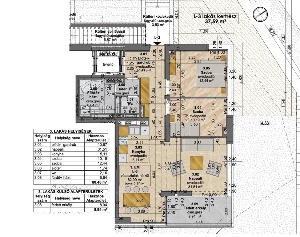 Az I. emeleti lakás 2+1 szobás, 82m2 alapterületű, 9 m2-es erkéllyel és 40 m2-es kizárólagos használatú kertrésszel rendelkezik. A lakáshoz a P3 számú parkoló megvásárolandó a teremgarázsban 18 M Ft/hely vételáron, valamint a T05 jelű tárolóhelyiség 6 M Ft összegért.