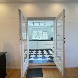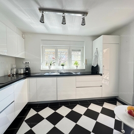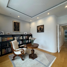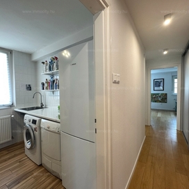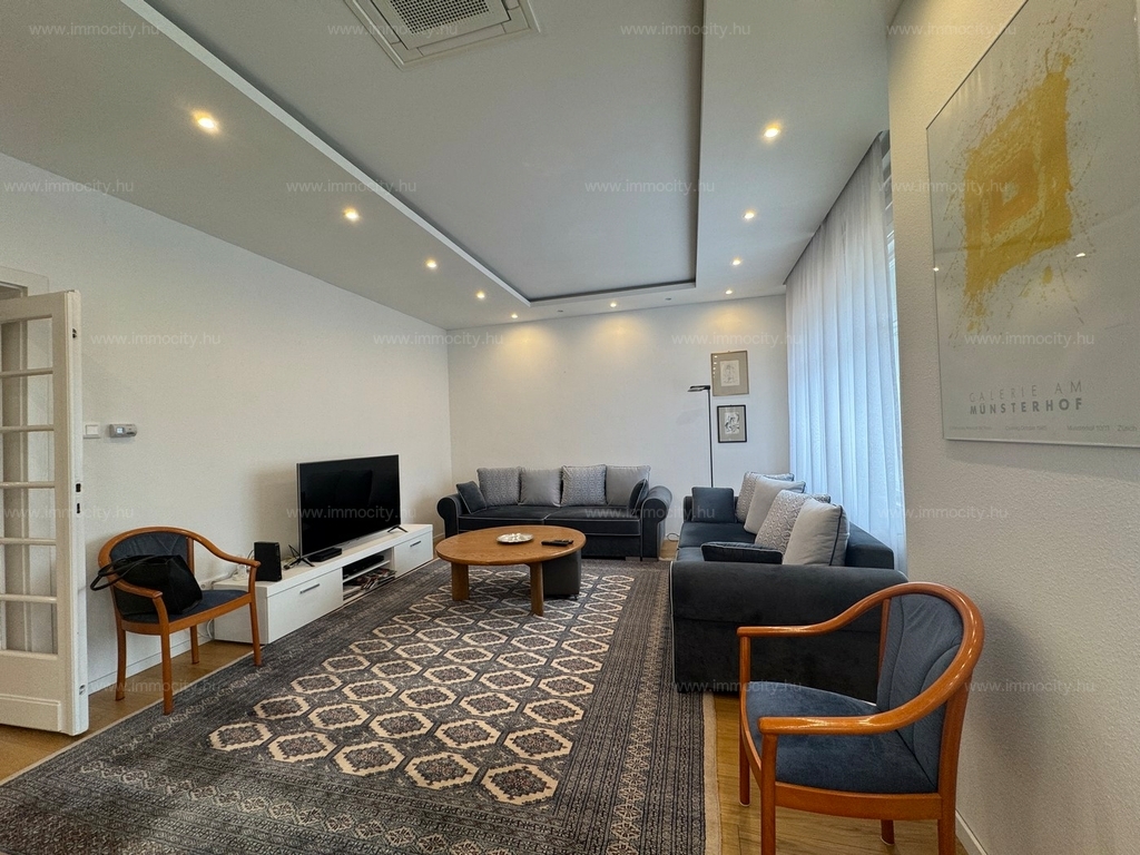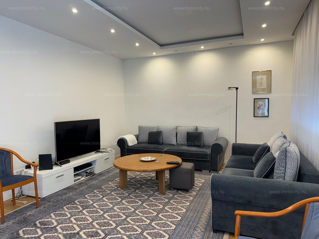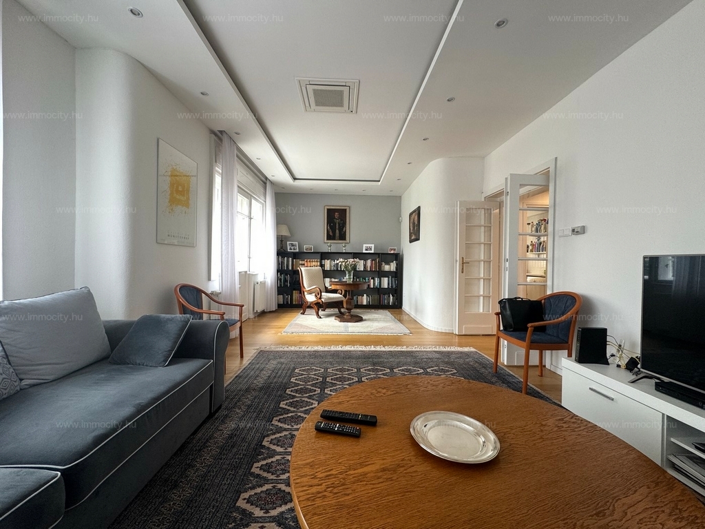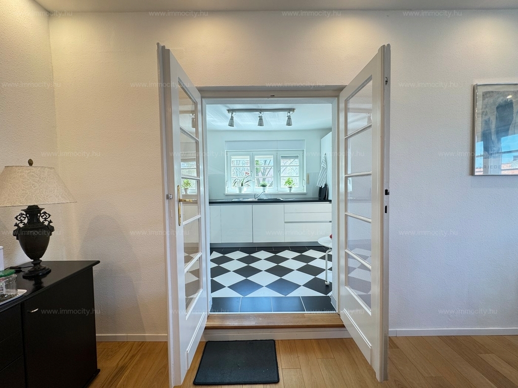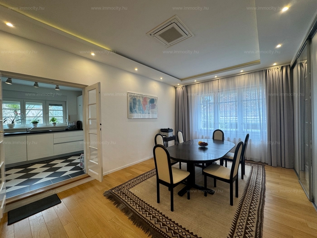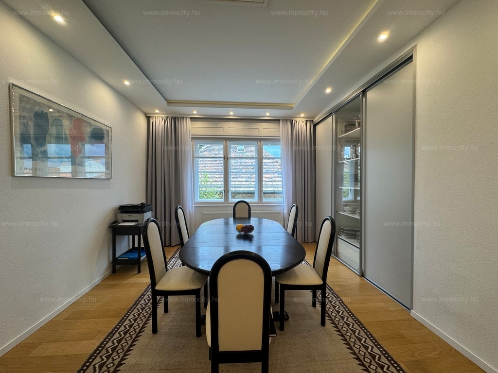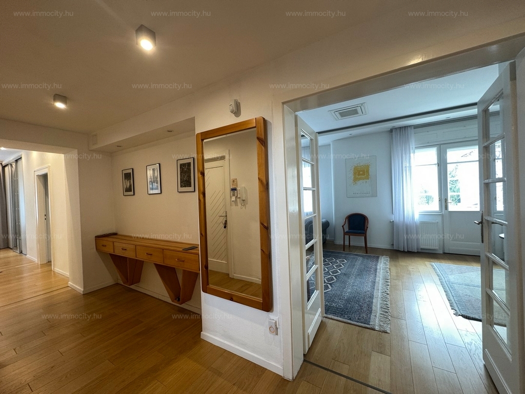 Jelenlegi kialakítása: tágas nappali kis erkéllyel, 2 hálószoba, ebédlő, garderobe, 2 fürdőszoba, ablakos mosókonyha. Minden helyiség a közlekedőből nyílik. A lakás központi helyisége a szép szárnyas ajtóval szeparálható konyha melletti 23 m2-es ebédlő nagy beépített szekrénnyel.