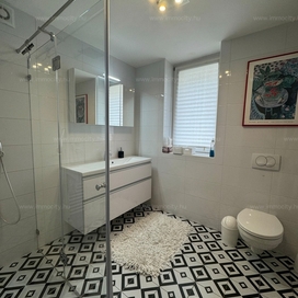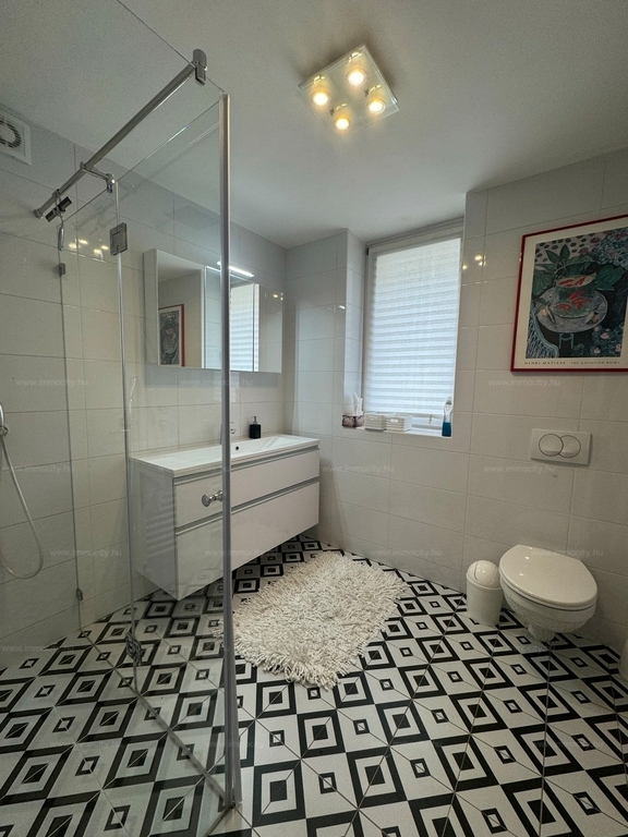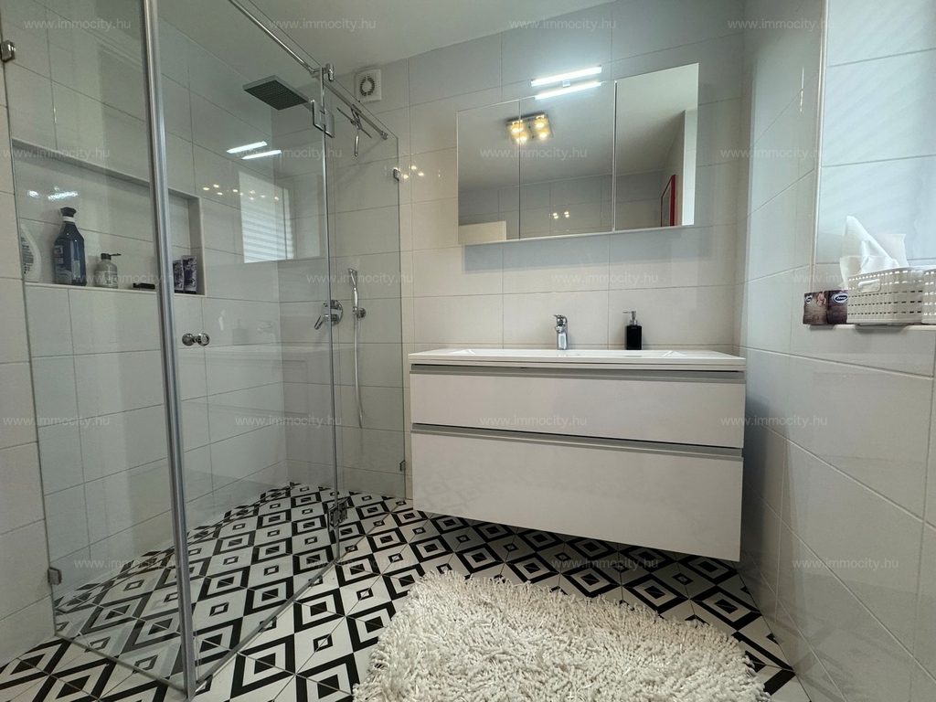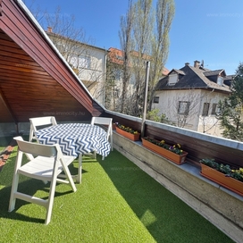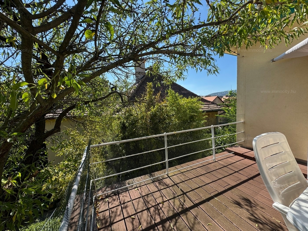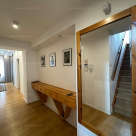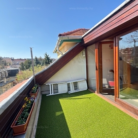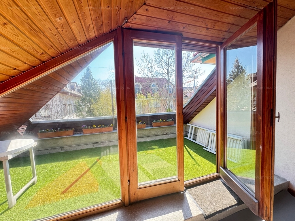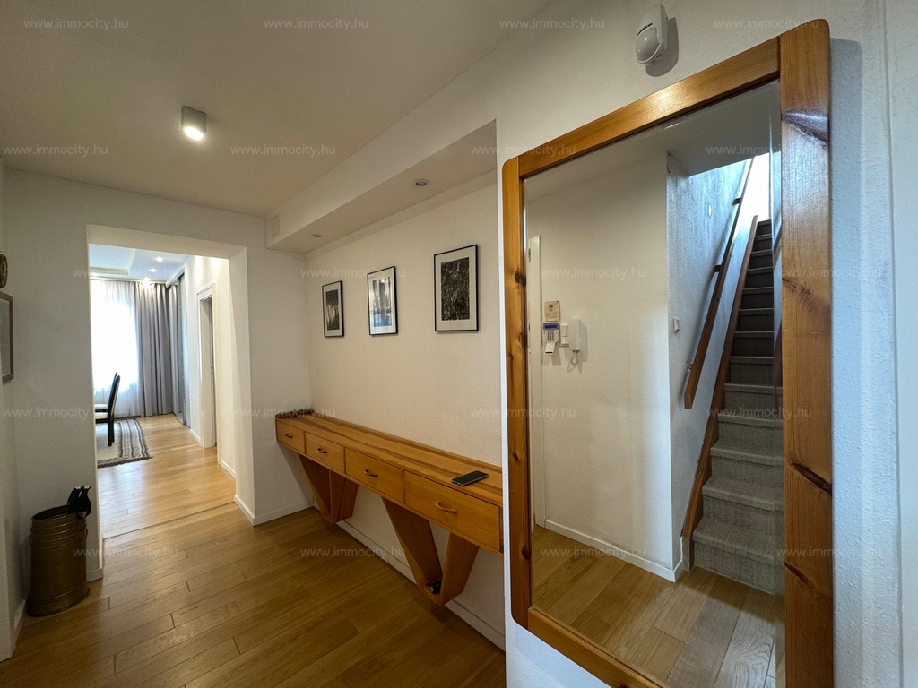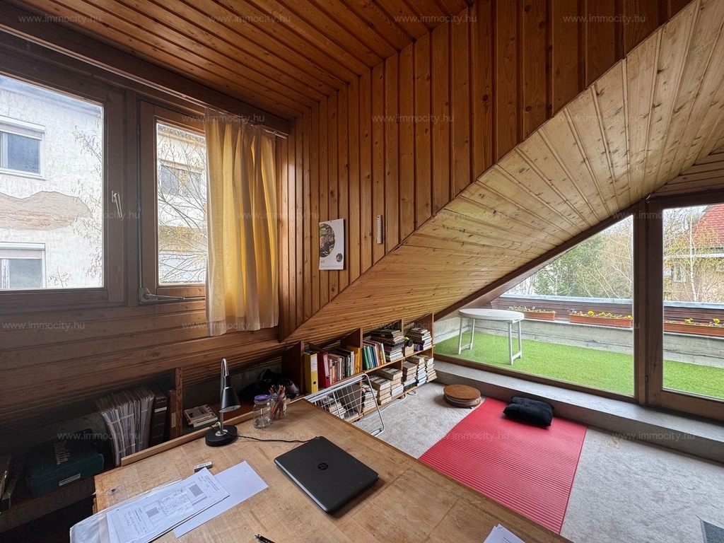 A szépen felújított alsó szint 134 m2, amit egy néhány belső lépcsővel megközelíthető, jelenleg nem használt teraszos tetőtéri szoba egészít ki. (a 25 m2 alapterületű helyiség 190 cm feletti területe 17 m2.) A hozzá kapcsolódó, több, mint 8 m2-es tetőterasszal együtt ez egy fiatal családtag álom-birodalma lehet, de a lakótértől elkülönített irodának is zseniális.