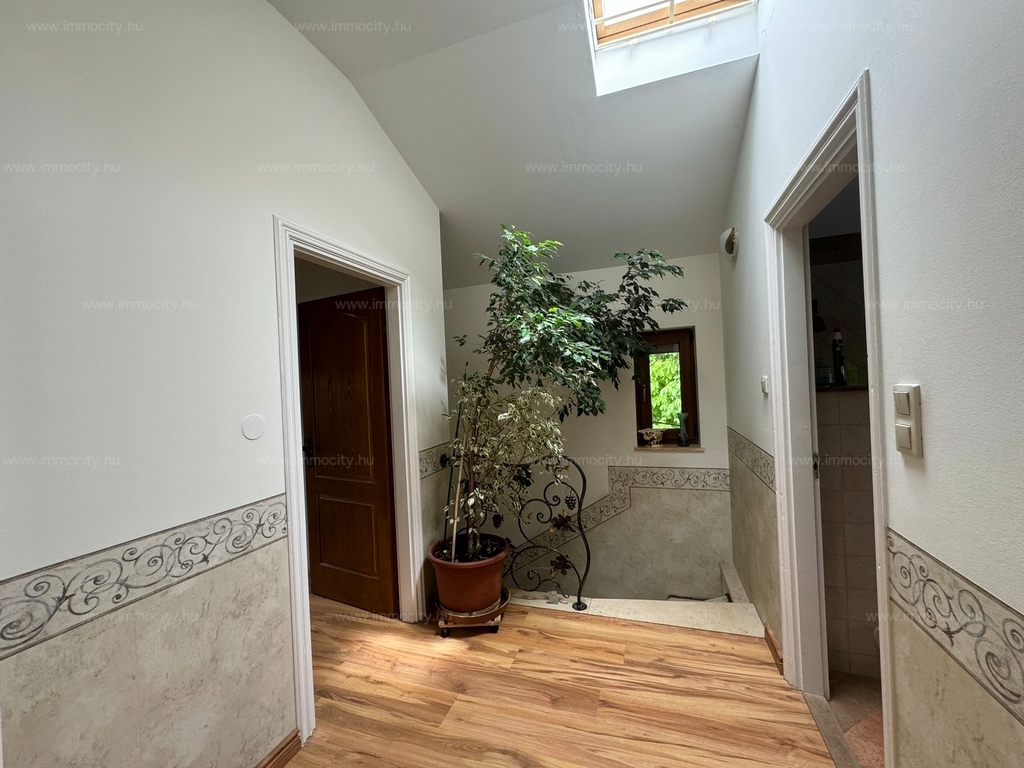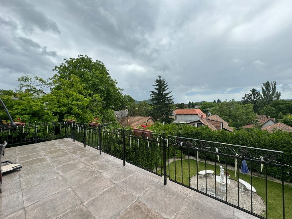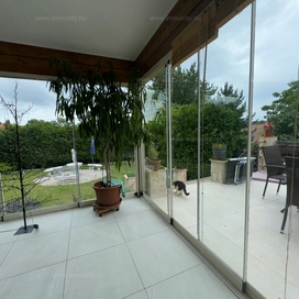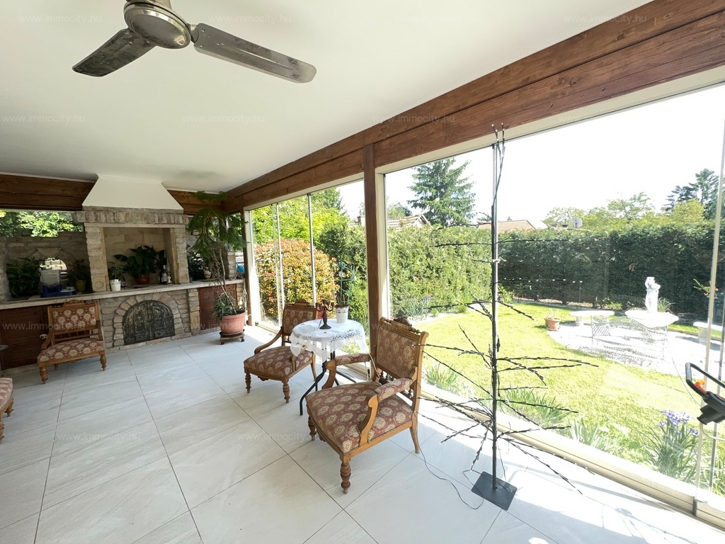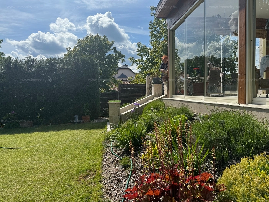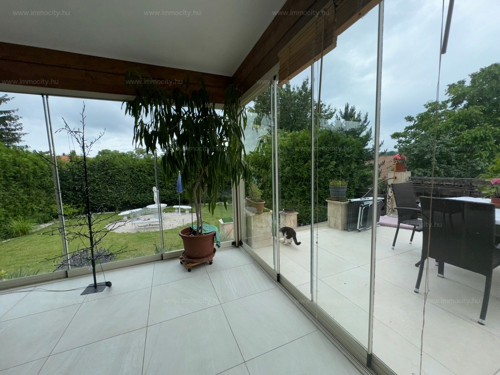 A földszinti tágas amerikai konyhás nappali és ebédlő terét egy további zárt télikert egészíti ki a ház teljes szélességében, amiből akár egy 3. hálószoba alakítható ki téglafalazattal. Ehhez egy 24 m2-es terasz kapcsolódik, és a parkosított, hangulatos kerttől csak néhány lépcső választja el.