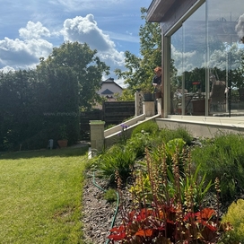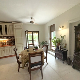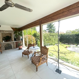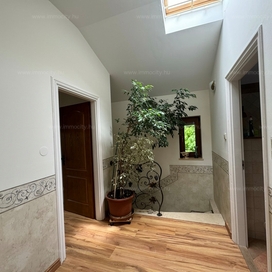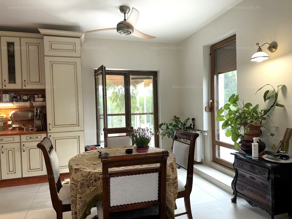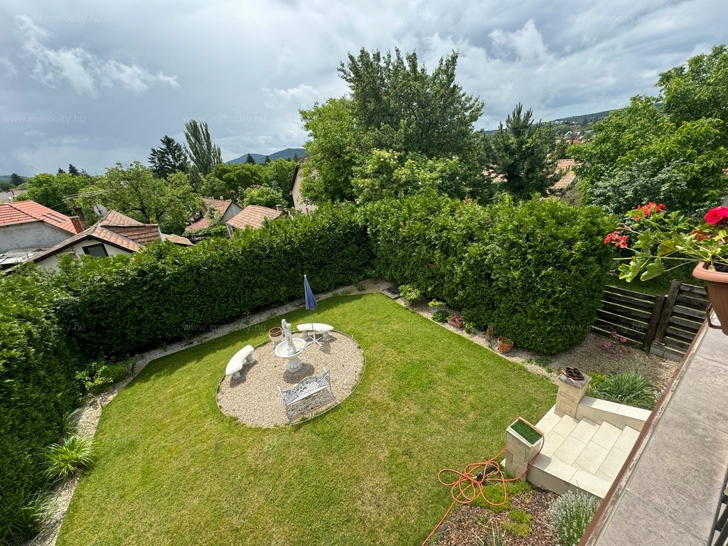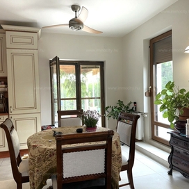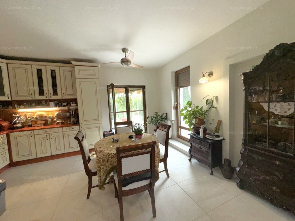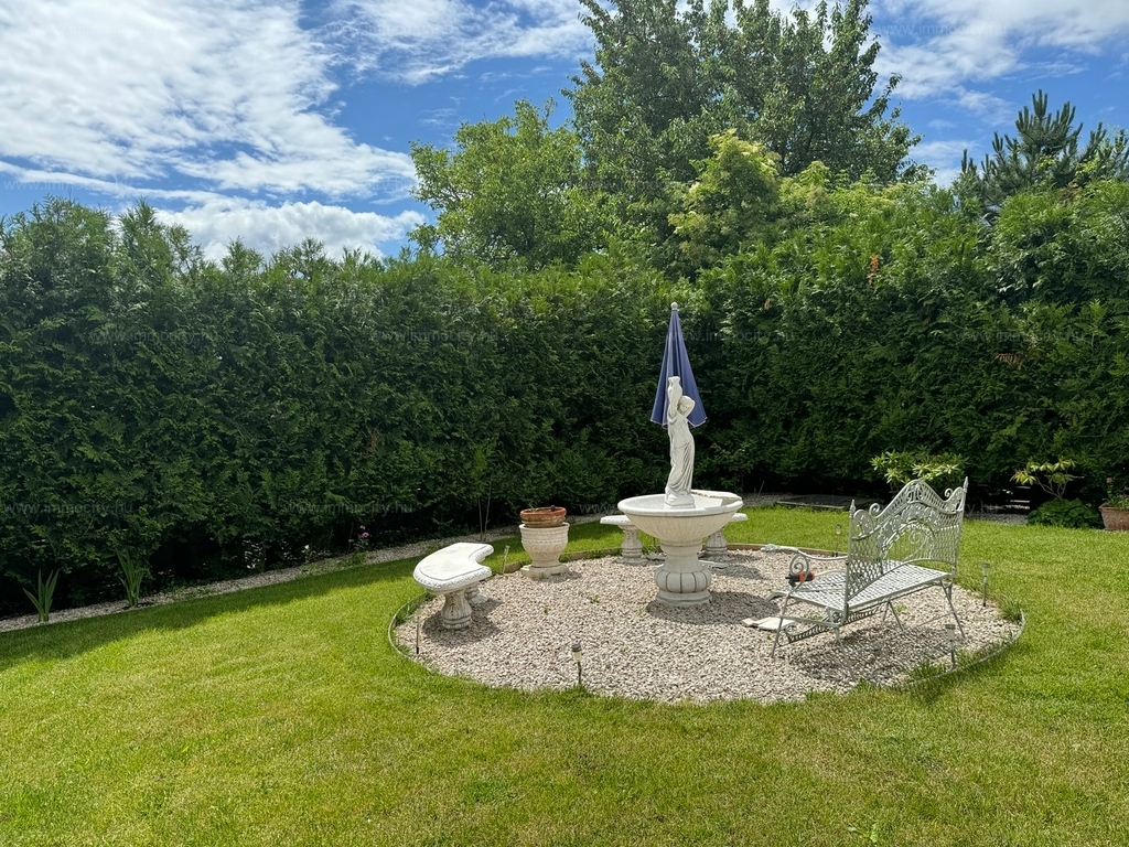 A földszinti tágas amerikai konyhás nappali és ebédlő terét egy további zárt télikert egészíti ki a ház teljes szélességében, amiből akár egy 3. hálószoba alakítható ki téglafalazattal. Ehhez egy 24 m2-es terasz kapcsolódik, és a parkosított, hangulatos kerttől csak néhány lépcső választja el.
