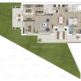 Az A épület földszinti, 5 szobás lakása 122 m2 alapterületű, 52,29 m2-es terasszal és 165 m2-es kizárólagos használatú kertrésszel rendelkezik.