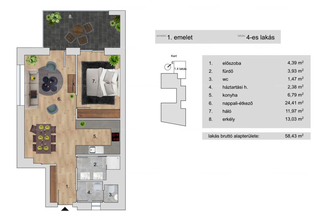 Az I.emeleti 2 szobás lakás 58,40 m2 alapterületű, 13,03 m2-es erkéllyel rendelkezik.