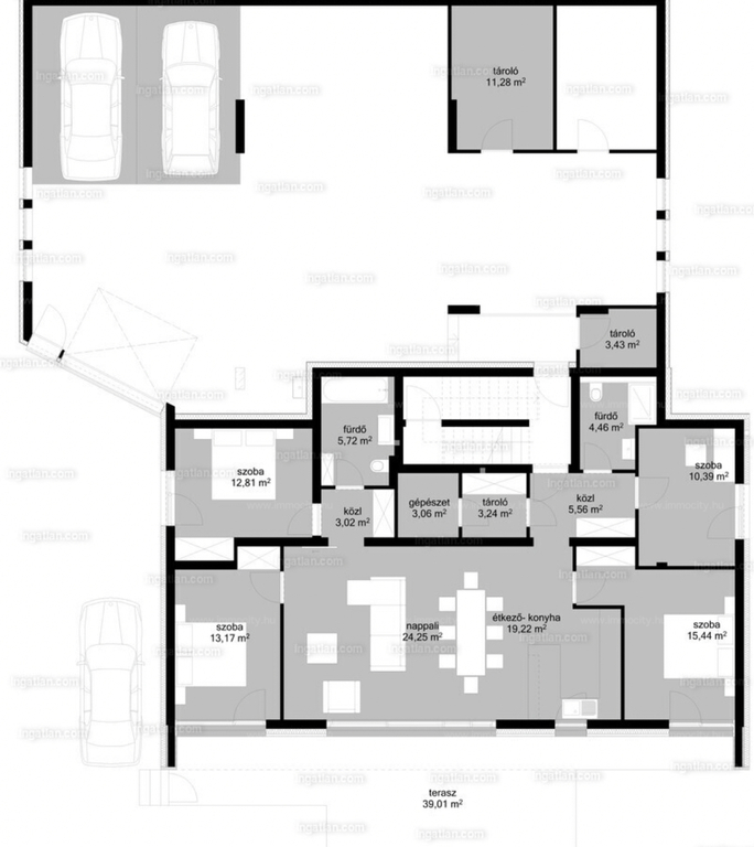 Kültéren 1 db, a teremgarázsban 2 db beállóhely, valamint 1 db 11 m2-es és 1 db 3 m2-es tároló tartozik a lakáshoz, melyeket együttesen 30.000.000 Ft-ért lehet megvásárolni.
