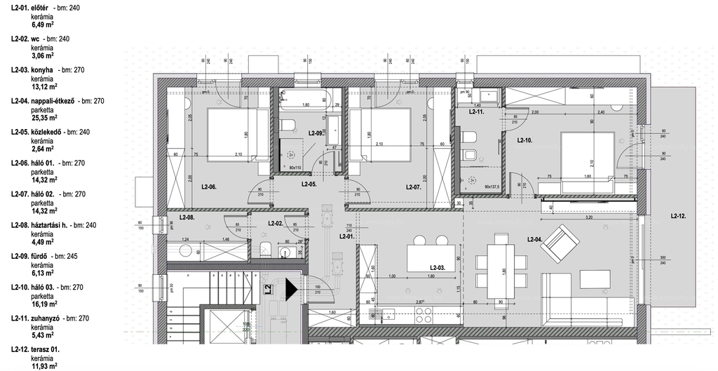 Az első emeleti 4 szobás lakás 113 m2 alapterületű és 12 m2-es erkéllyel rendelkezik.