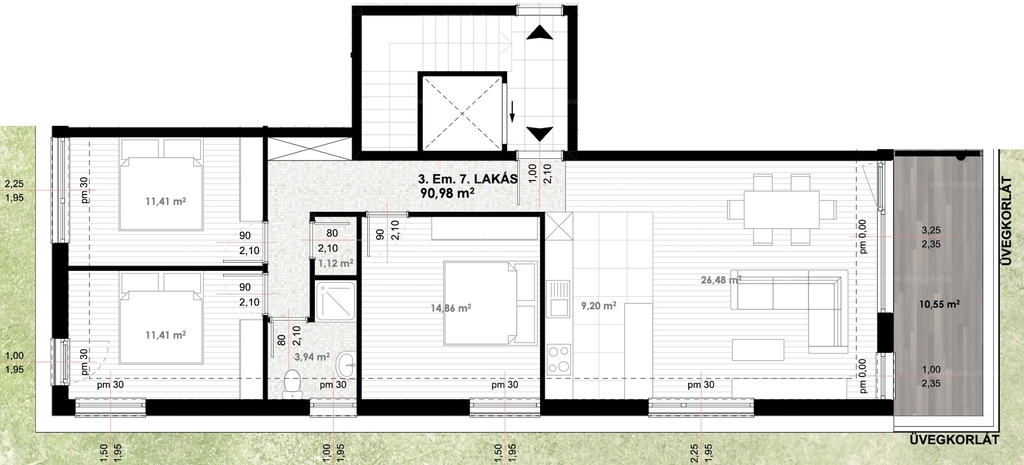 A III. emeleti penthouse lakás 3 szobás, 86,91 m2 alapterületű és 33,09 m2-es terasszal rendelkezik.