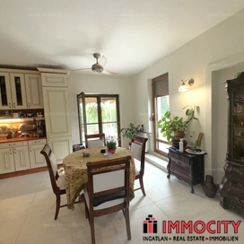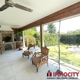 A földszinti tágas amerikai konyhás nappali és ebédlő terét egy további zárt télikert egészíti ki a ház teljes szélességében, amiből akár egy 3. hálószoba alakítható ki téglafalazattal. Ehhez egy 24 m2-es terasz kapcsolódik, és a parkosított, hangulatos kerttől csak néhány lépcső választja el.