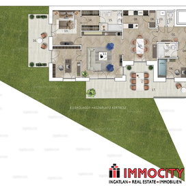 Az A épület földszinti, 5 szobás lakása 122 m2 alapterületű, 52,29 m2-es terasszal és 165 m2-es kizárólagos használatú kertrésszel rendelkezik.