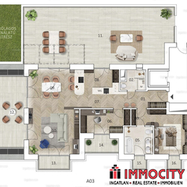 Az A épületben található I. emeleti, 3 szobás lakás 97 m2 alapterületű, összesen 103,70 m2 területű terasszal és 40 m2-es kizárólagos használatú kertrésszel rendelkezik.