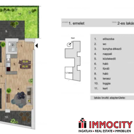Az I.emeleti 3 szobás lakás 69,10 m2 alapterületű, 10,59 m2-es erkéllyel és 23,62 m2-es kizárólagos használatú kertrésszel rendelkezik.