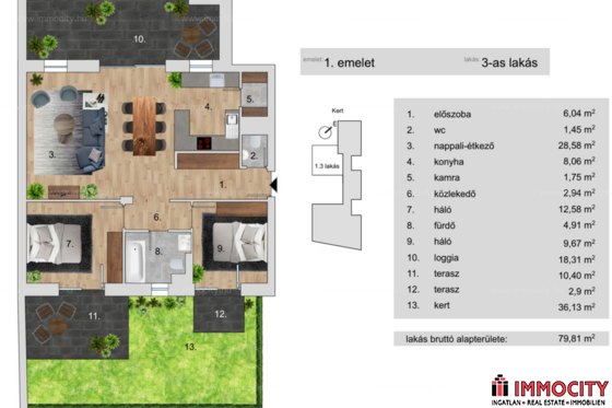 Az I.emeleti 3 szobás lakás 79,80 m2 alapterületű, 26,58 m2-es erkéllyel és 36,13 m2-es kizárólagos használatú kertrésszel rendelkezik.