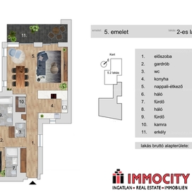 Az V. emeleti 3 szobás lakás 100,60 m2 alapterületű és összesen 12,41 m2 teraszkapcsolattal rendelkezik.