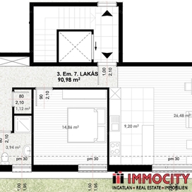 A III. emeleti penthouse lakás 3 szobás, 86,91 m2 alapterületű és 33,09 m2-es terasszal rendelkezik.