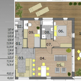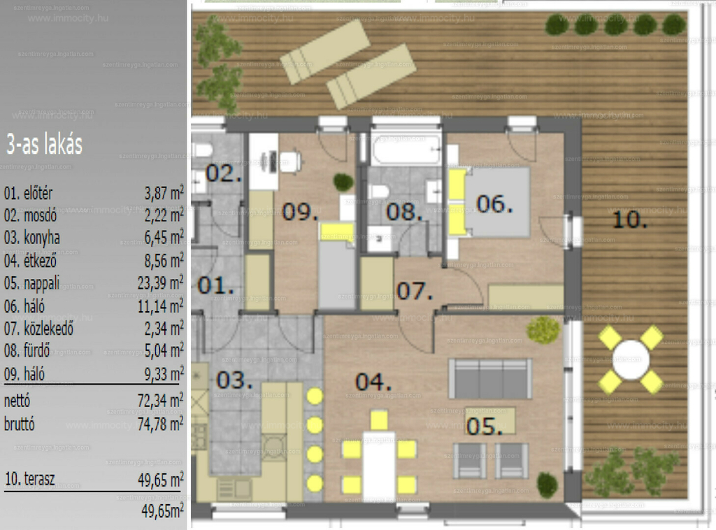 Az első emeleti lakás 1+2 szobás, 72,34 m2 alapterületű és egy 49,65 m2-es terasszal rendelkezik.