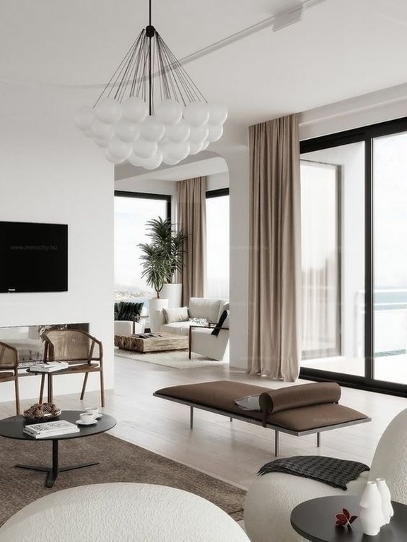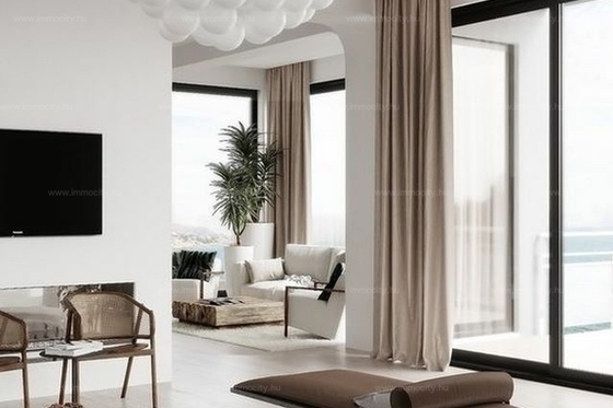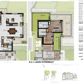A belső kétszintes, panorámás, nagy méretű családi otthon kiegészítői az erkély, a nagy méretű tetőterasz és a zöldtető.