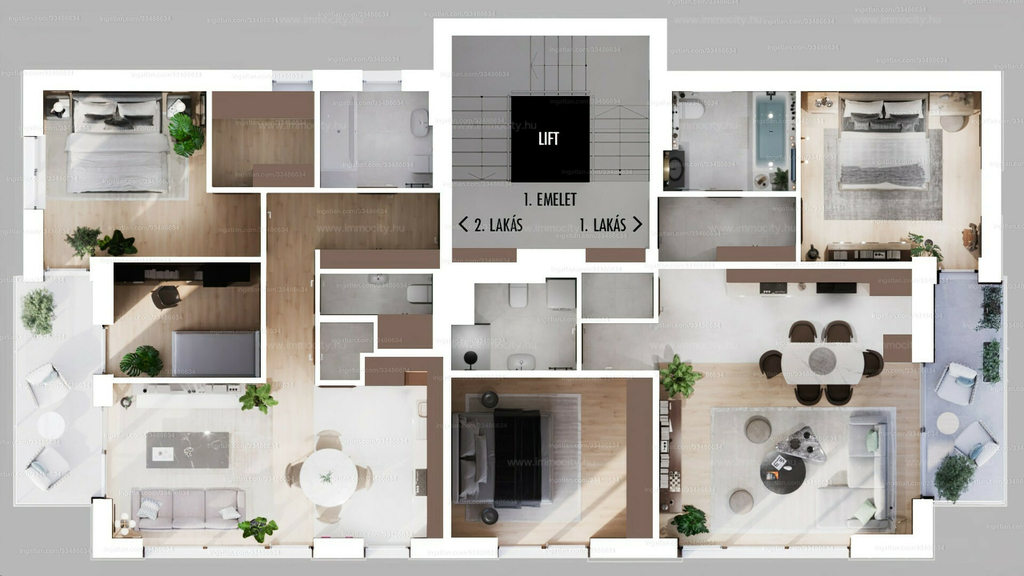 1. emeleti kert felé néző lakás: 73 m2 + 8 m2 terasz 266,610 M Ft.