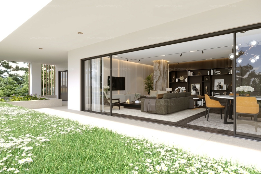 A két, 150 m2-es földszinti családi otthonhoz a nagy teraszokon kívül 100 m2, ill. 200 m2-es kizárólagos használatú kertrész tartozik.