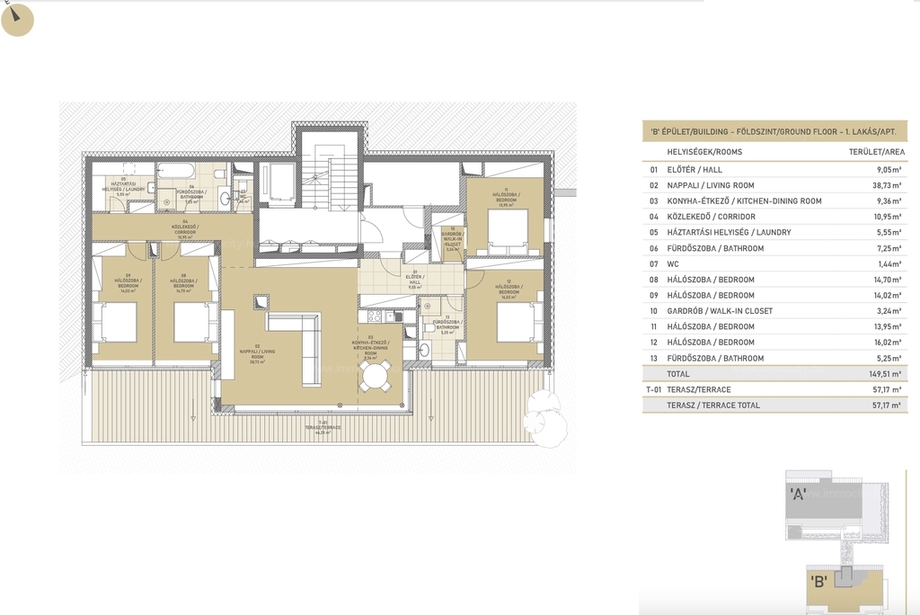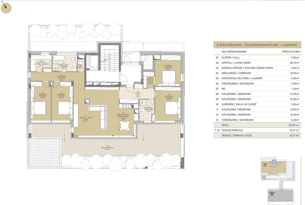 Az 5 szobás földszinti lakás 149,51 m2 alapterületű, 57,17 m2-es terasszal és 200 m2-es kizárólagos használatú kertrésszel rendelkezik.
