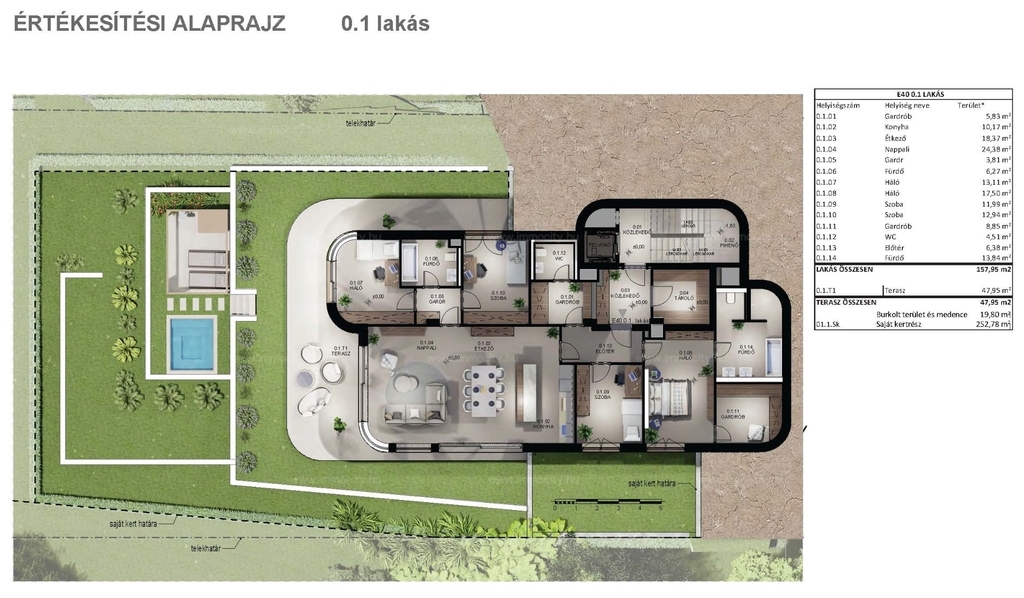 Az 5 szobás lakás 157,95 m2 alapterületű, 47,95 m2-es terasszal és 252,78 m2-es kizárólagos használatú kertrésszel rendelkezik.