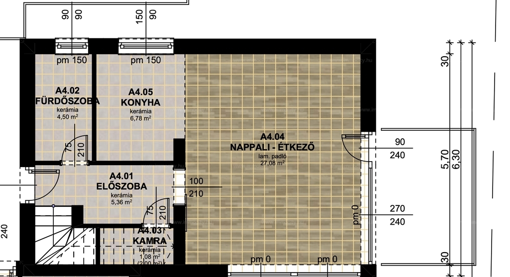 A belső kétszintes 3+1 szobás lakás 104 m2 alapterületű, összesen 20 m2 terasszal és 150 m2-es kizárólagos használatú kertrésszel rendelkezik.