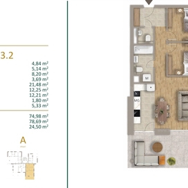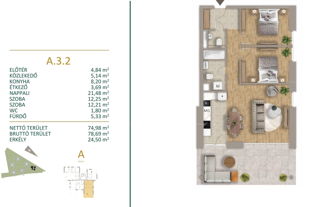 A III. emeleti 3 szobás lakás 74,94 m2 alapterületű, 24,50 m2-es erkéllyel rendelkezik.