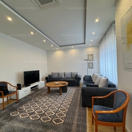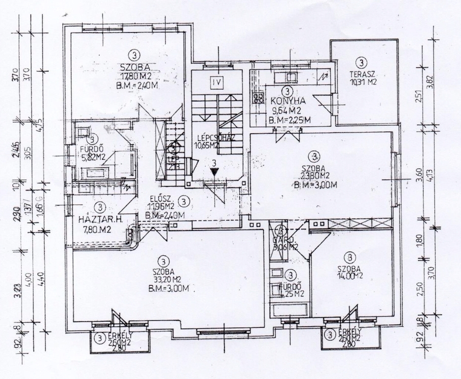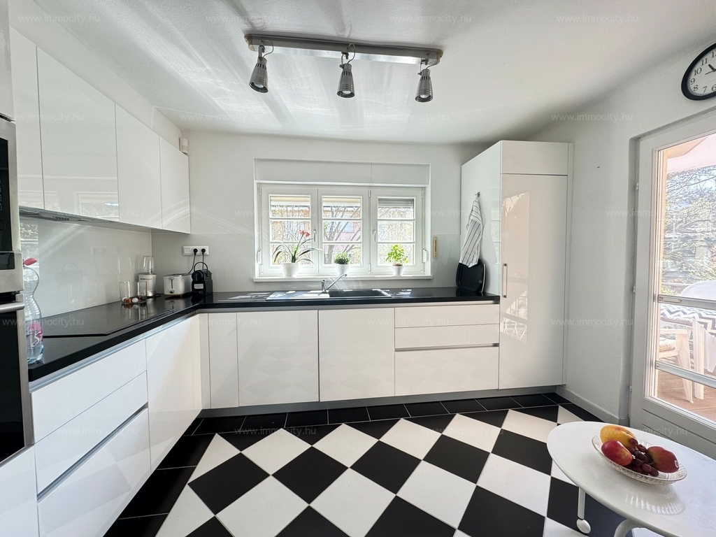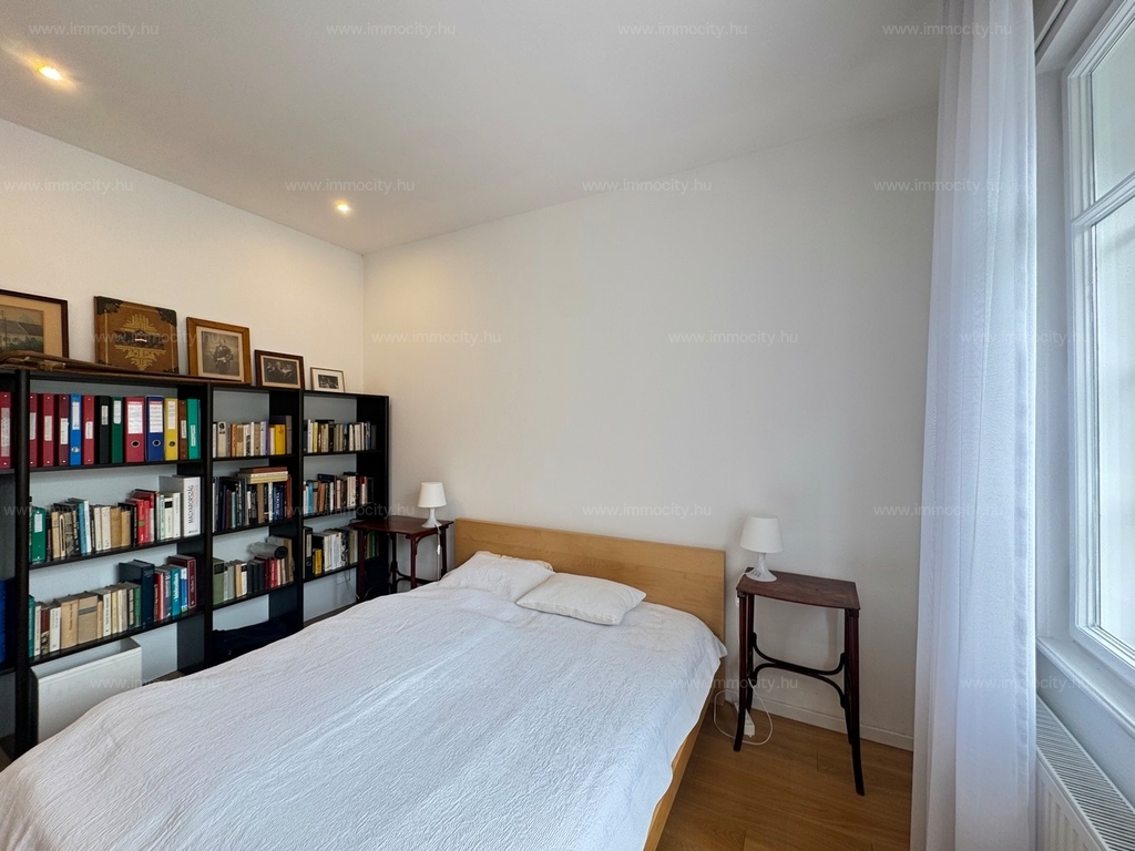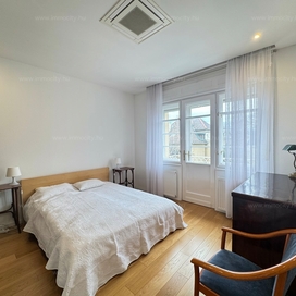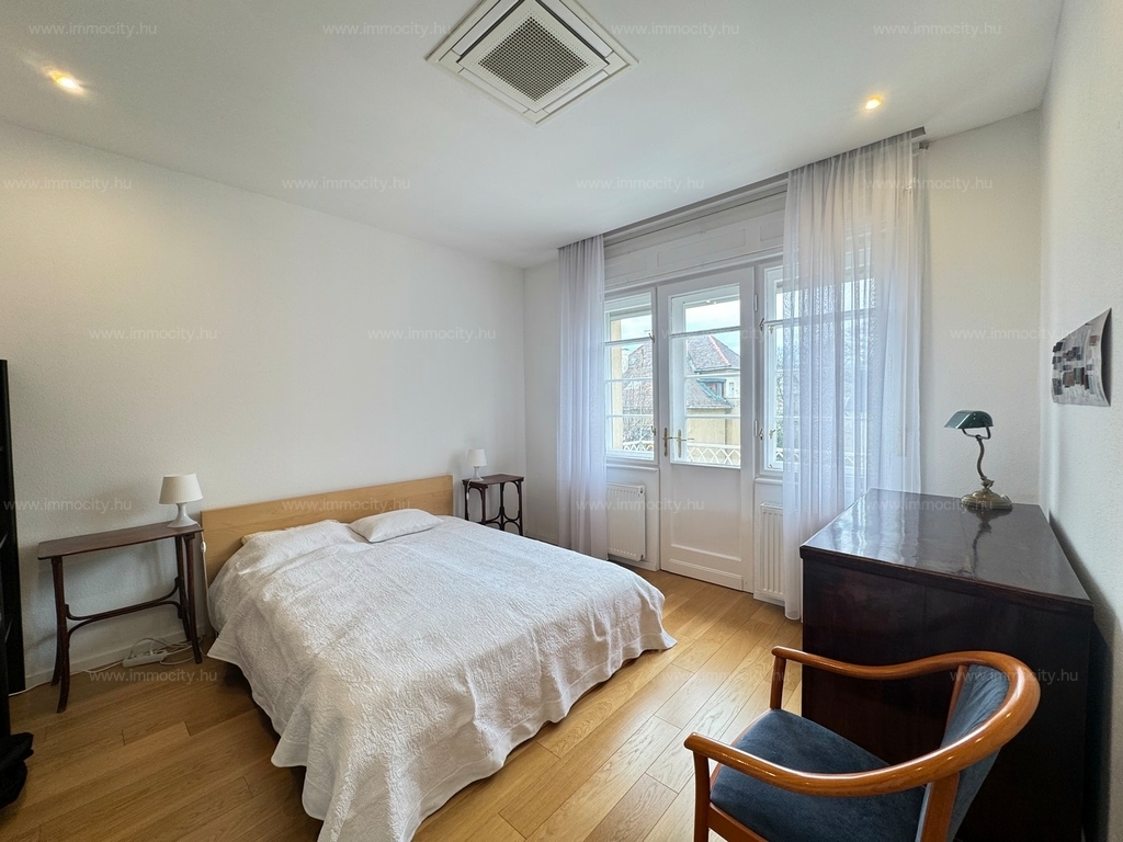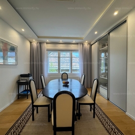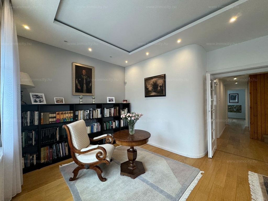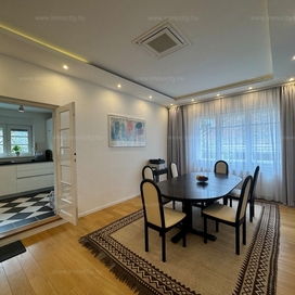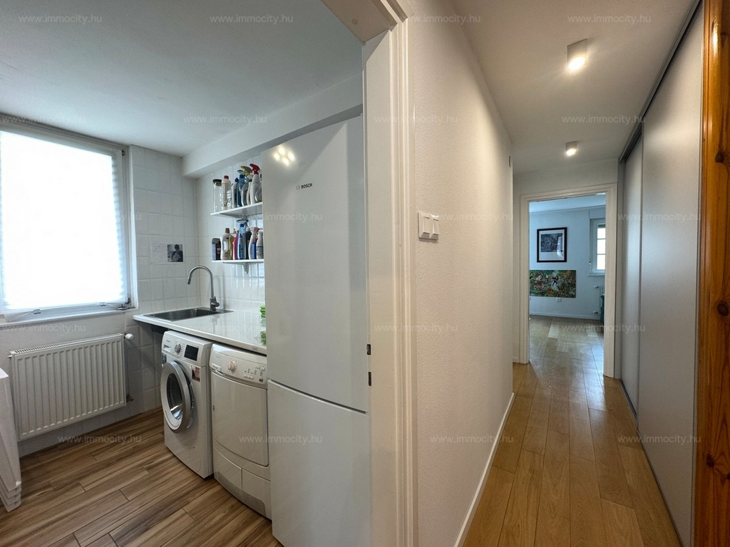 Jelenlegi kialakítása: tágas nappali kis erkéllyel, 2 hálószoba, ebédlő, garderobe, 2 fürdőszoba, ablakos mosókonyha. Minden helyiség a közlekedőből nyílik. A lakás központi helyisége a szép szárnyas ajtóval szeparálható konyha melletti 23 m2-es ebédlő nagy beépített szekrénnyel.