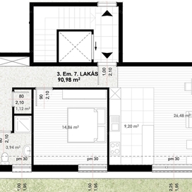 A III. emeleti penthouse lakás 3 szobás, 86,91 m2 alapterületű és 33,09 m2-es terasszal rendelkezik.