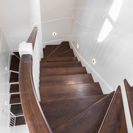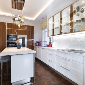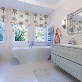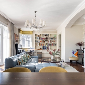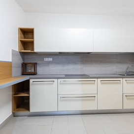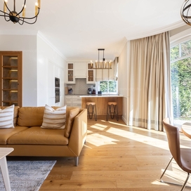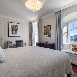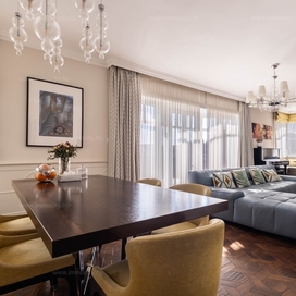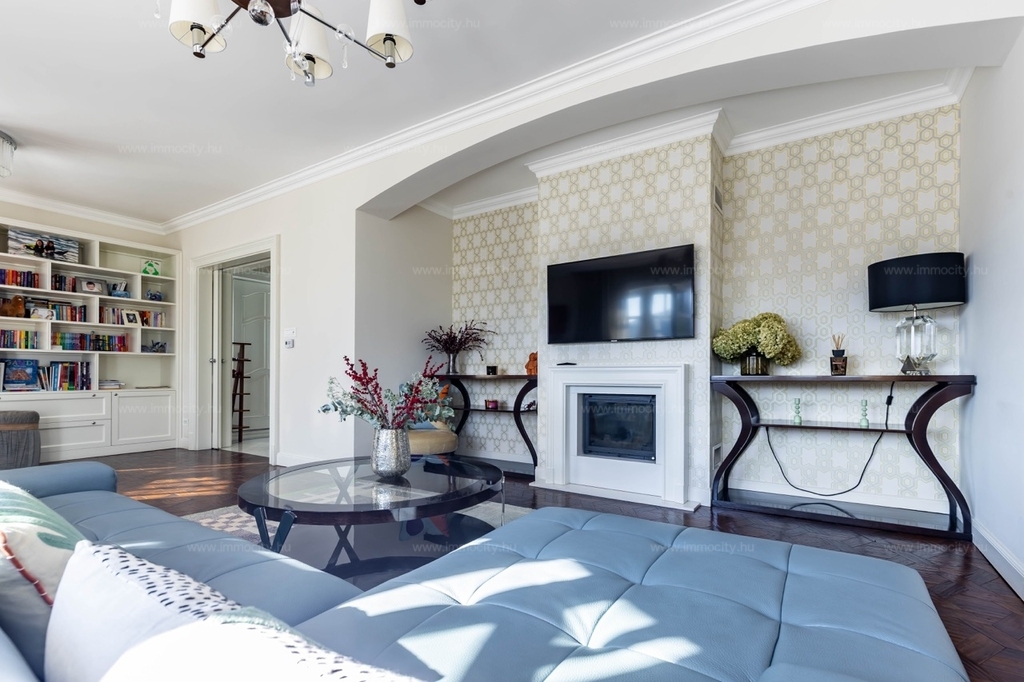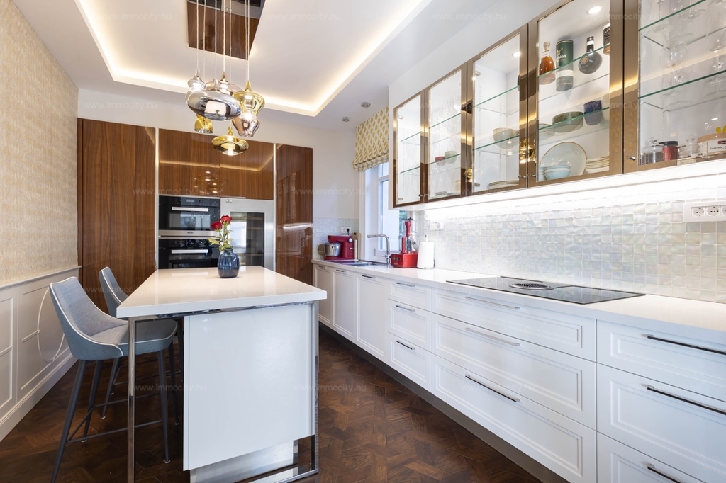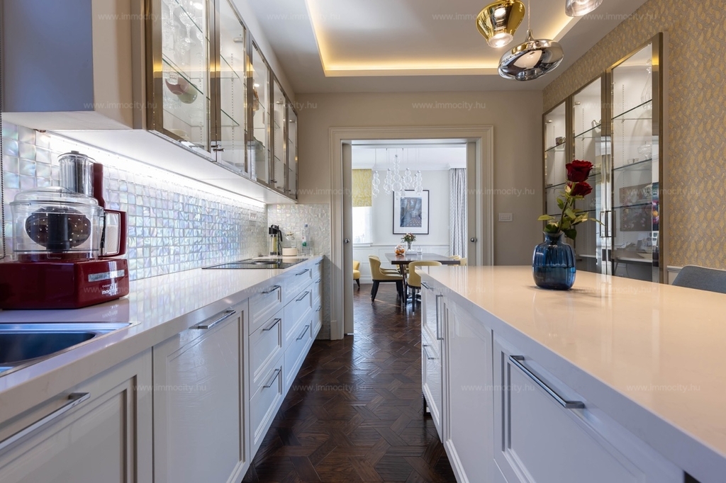 A nagyobbik, 163m2-es belső kétszintes, teraszos lakás nappali-ebédlő-konyha együttese különös eleganciát sugároz, mind adottságát tekintve, mind a beépített bútorok és kiegészíő berendezések tekintetében. A konyha - bár diszkréten szeparált a nappalitól - de stílusával, az egyedi design-nal harmonikusan kapcsolódik a lenyűgöző élettérhez. A felső szinten található 3 hálószobához elegáns, ablakos fürdőszobák tartoznak, külön garderobe és háztartási helyiség.