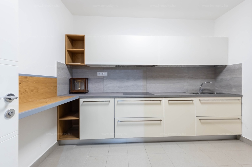 A kertkapcsolatos 93m-es lakás tágas, napfényes amerikai konyhával felszerelt nappaliból, 2 hálószobából, 2 fürdőszobából és garderobe helyiségekből áll,