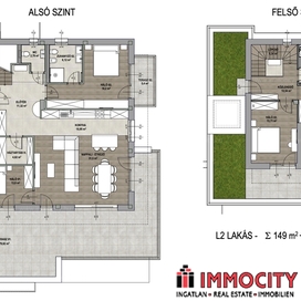 Az épületben található másik lakás 3+1 szobás, szintén 149 m2 alapterületű, 38 m2-es terasszal, valamint kizárólagos használatú kertrésszel rendelkezik, a lakás vételára 660 M Ft.