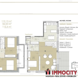 A belső kétszintes, 4 szobás lakás 112 m2 alapterületű, 34,22 m-es terasszal és 115 m2-es, egyedi öntözőrendszerrel felszerelt kizárólagos használatú kertrésszel rendelkezik.