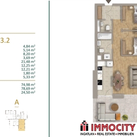 A III. emeleti 3 szobás lakás 74,94 m2 alapterületű, 24,50 m2-es erkéllyel rendelkezik.