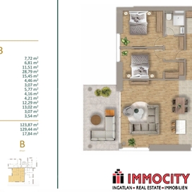 Az I. emeleti 4 szobás lakás 123,87 m2 alapterületű és 17,84 m2-es erkéllyel rendelkezik.