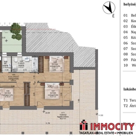 A földszinti 4 szobás lakás 107,85 m2 alapterületű, 49,27 m2-es terasszal, 14,59 m2-es átriummal és egy 48,60 m2-es kizárólagos használatú kertrésszel rendelkezik.